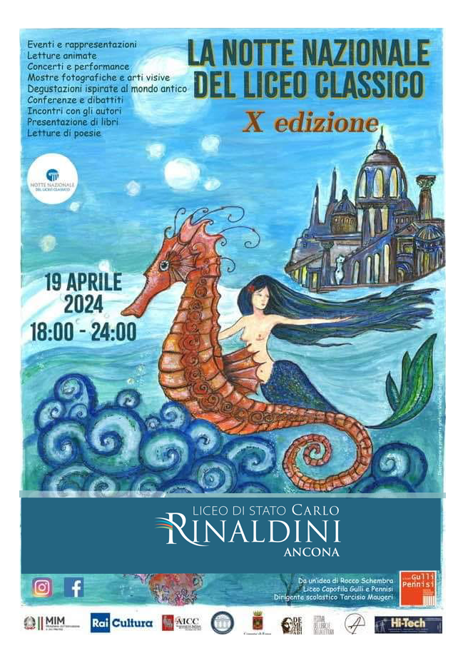 19:30 - Musica (Aula Magna) - Navigatio vitae (Aula meet) - Viaggio tra le costellazioni: un'odissea celeste (3F) - L'anello di Policrate (5G) - Ancona città di mare (gioco a quiz) (5F) - Sei una sagoma! (Aula I piano)