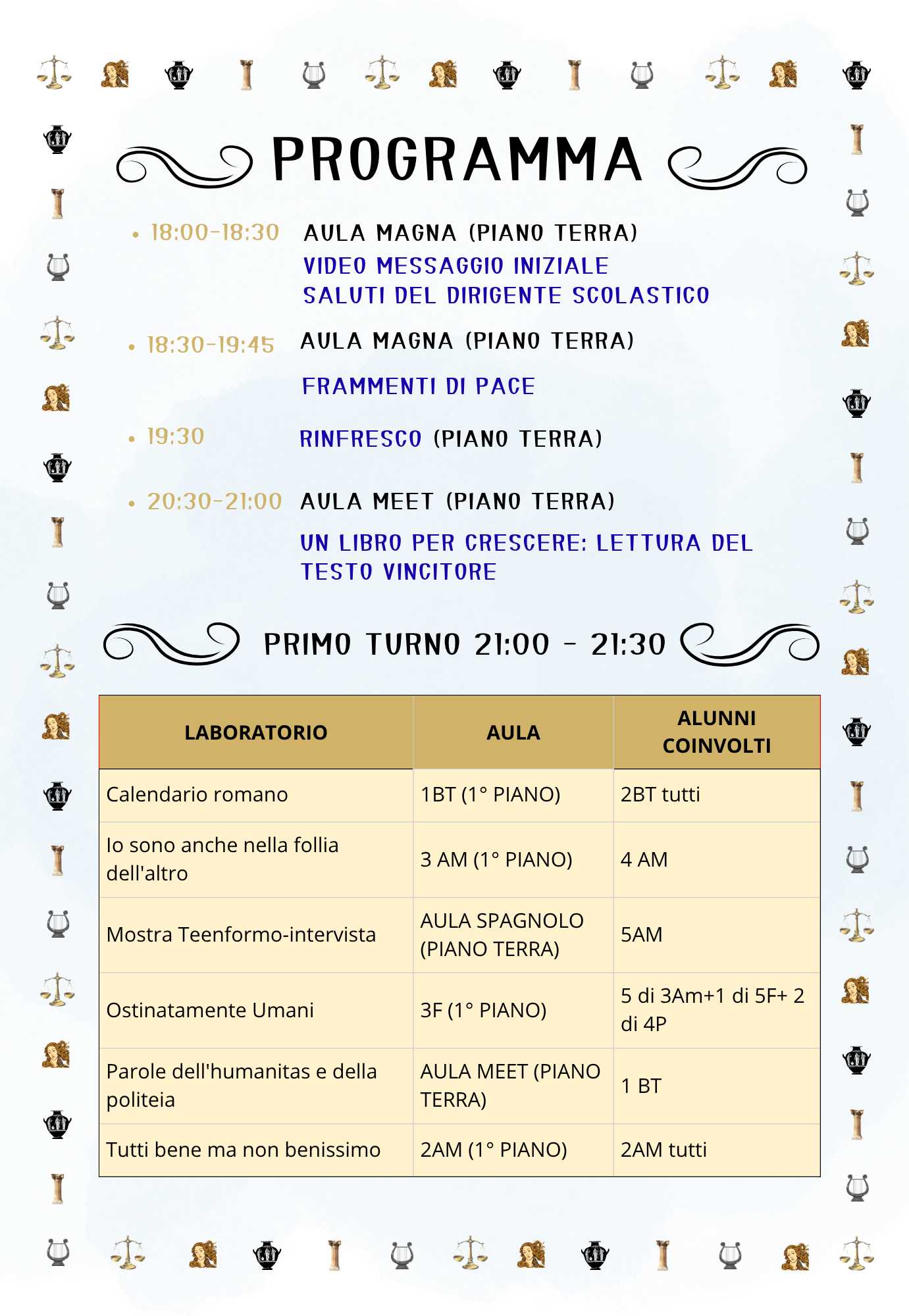 • 🏛️ 18:00 | Apertura e proiezione del video ufficiale della Notte Nazionale del Liceo Classico in Aula Magna.
