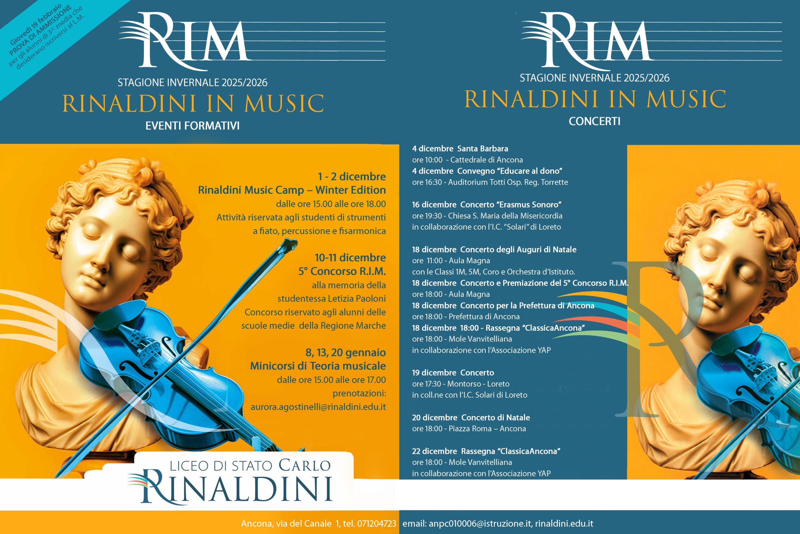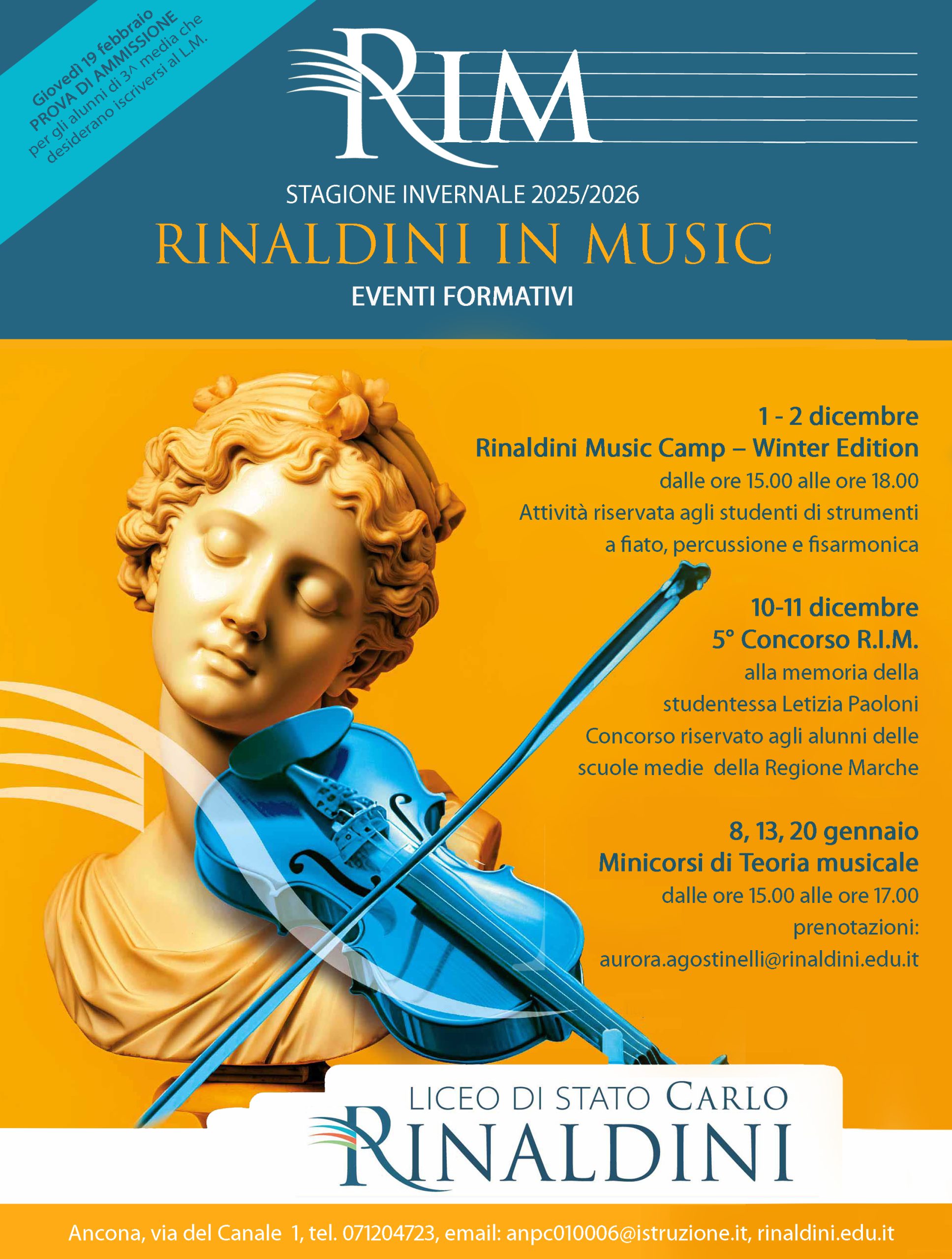 Gen15:00 - Prova di Ammissione (idoneità) al Liceo Musicale Riservata agli alunni delle classi terze medie interessati all’iscrizione al Liceo Musicale. (Modulo di iscrizione disponibile sul sito del Liceo “C. Rinaldini”). - dalle ore 15.00